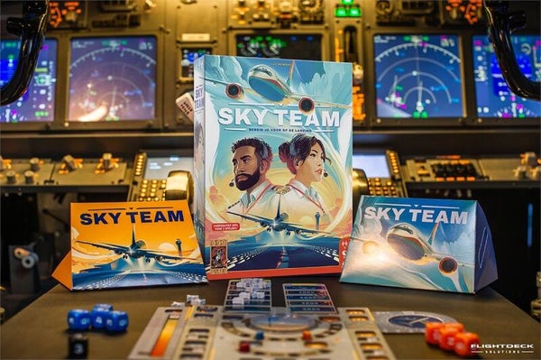 In Sky Team proberen jullie als piloot en copiloot in 7 ronden jullie vliegtuig veilig te laten landen. Eerst kiezen jullie een vliegveld en een scenario. Elke ronde mogen jullie dan kort overleggen voordat jullie met de dobbelstenen gooien. Vanaf dat moment is er geen communicatie meer toegestaan en mogen jullie elkaars dobbelstenen ook niet zien. Om beurten leggen jullie een dobbelsteen op bijvoorbeeld de motoren, vliegtuigkleppen, het landingsgestel of de as. Elke gelegde dobbelsteen heeft zijn eigen voorwaarden en gevolgen. Jullie proberen daarbij met elkaar samen te werken en de volgorde waarin je collega zijn dobbelstenen legt zo goed mogelijk te interpreteren. Nadat alle dobbelstenen zijn ingezet en het vliegtuig nog in de lucht zweeft, begint de volgende ronde. Bereiken jullie na 7 ronden met de juiste snelheid en in horizontale positie het vliegveld, dan winnen jullie het spel. Maar de volgende zware uitdaging wacht dan alweer.