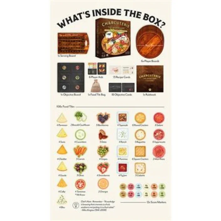 In Charcuterie: The Board Game nemen 2-6 spelers om de beurt smaakvolle voedselschaakjes en plaatsen ze op hun borden, waarbij ze zorgvuldig nadenken over de rangschikking voor de uiteindelijke presentatie!