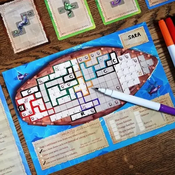 In The Isle of Cats Explore & Draw kiezen spelers elke ronde een set kaarten en tekenen vervolgens hun ontdekkingen op hun boot.