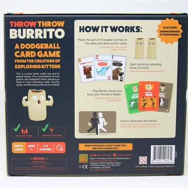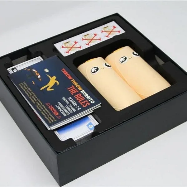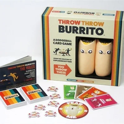 Throw Throw Burrito is een hilarisch partyspel van de makers van Exploding Kittens. Het is een combinatie van een kaartspel en trefbal. Het spel is geschikt is voor de hele familie en draait om kaarten verzamelen, punten verdienen en zachte burrito’s naar elkaar gooien…