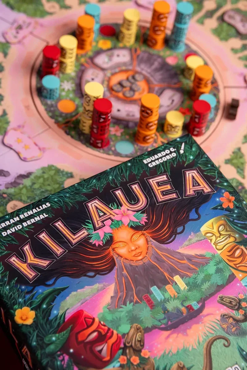 Kilauaea, van David Bernal en Ferran Renalias, is een spel met zeer eenvoudige regels, maar met een puntensysteem dat spelers dwingt om altijd op de hoogte te zijn van hoe het aantal Tiki's van elke kleur in elk vulkaangebied verandert, en om verstandig te bepalen waar en welke ze op hun persoonlijke eiland plaatsen.