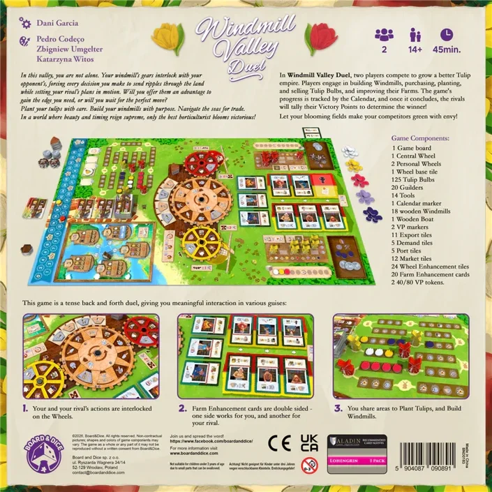 De zon komt op boven de tulpenvelden in de vallei, waar hoge windmolens afsteken tegen de horizon en schepen klaar liggen om jouw bloemen over zee te vervoeren. In Windmill Valley Duel strijden 2 rivaliserende horticulteurs om prestige, rijkdom en overwinning door de mooiste tulpen te kweken, te investeren in krachtige verbeteringen en de meest strategische havens te claimen in dit kleurrijke, schilderachtige landschap.