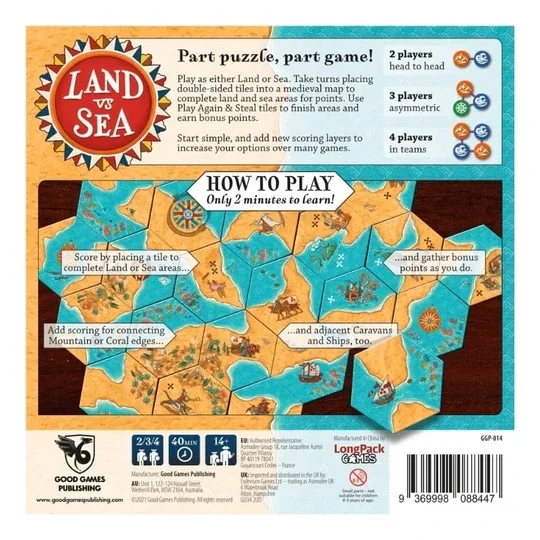 Deels puzzel, deels spel. Speel als land of zee (of de cartograaf in een spel met 3 spelers). Elke speler speelt met 2 dubbelzijdige zeshoekige tegels met een mix van land- en zeevormen. Om de beurt leggen ze elk een tegel om samen een kaart te maken. Land plaatst tegels die landgebieden proberen te voltooien, en Zee plaatst tegels die proberen zeegebieden te voltooien. Voltooide gebieden scoren een punt per tegel; landgebieden voor land, zeegebieden voor zee. Sommige tegels leveren bonuspunten op voor degene die het gebied waarin ze zich bevinden voltooit. Spelers kunnen dus besluiten om strategisch de gebieden van rivalen te voltooien om hun bonuspunten te verdienen. Met andere tegels kunnen spelers hun tweede tegel spelen of de tegel van een speler stelen - maar niet hun laatste!